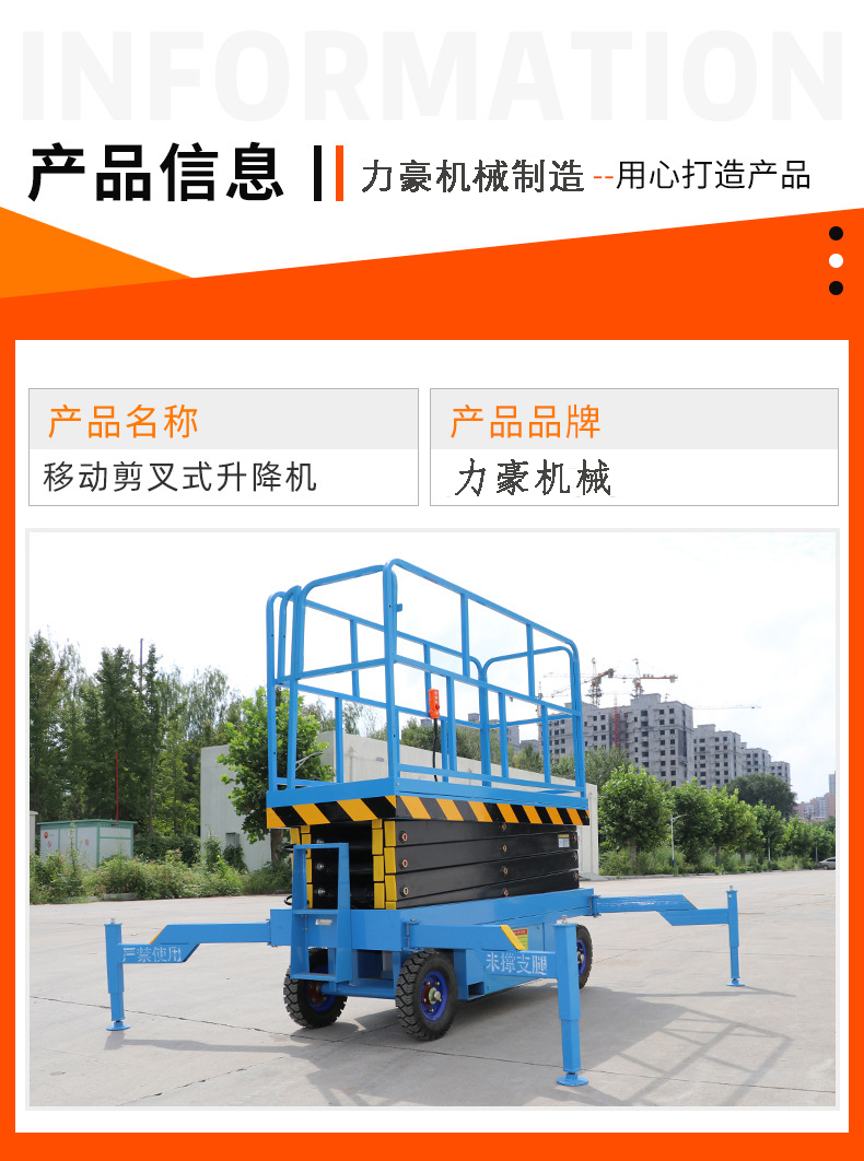 ??移動(dòng)升降平臺(tái)根據(jù)需求可選為二相、三相、電瓶、柴油機(jī)為升降動(dòng)力,特殊場(chǎng)所也可選用防爆電機(jī)、電器等。該升降平臺(tái)控制方式為電動(dòng)上、下控制升降,手、電兩用或遙控器控制,在停電時(shí)仍可使用。該系列升降平臺(tái)具有移動(dòng)靈活,升降平穩(wěn),載重量大,操作方便等特點(diǎn),移動(dòng)升降機(jī)廣泛用于工廠、糧庫(kù)、機(jī)場(chǎng)、加油站、機(jī)關(guān)、碼頭、野外電力、路燈維護(hù)及建筑裝修等各種行業(yè)。移動(dòng)升降平臺(tái)可根據(jù)用戶使用要求設(shè)計(jì)制造。 移動(dòng)式升降機(jī)有人工移動(dòng)式升降機(jī)、電動(dòng)移動(dòng)式升降平臺(tái),另備有手壓泵,供停電時(shí)使用,具有移動(dòng)靈活、升降平穩(wěn)、操作方便、載重量大等特點(diǎn)。升降動(dòng)力分為220V或380V電源,采用國(guó)外和國(guó)產(chǎn)液壓泵站.