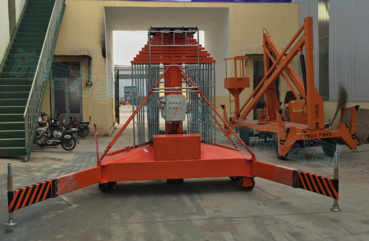 套缸式升降作業(yè)平臺(tái):也叫做套缸式升降平臺(tái),最大高度可升降30米,是一種多用途的高空作業(yè)機(jī)械,其功能將載有作業(yè)人員和使用器材的平臺(tái)送到指定高度進(jìn)行空中作業(yè)的特種工程設(shè)備。這種設(shè)備被廣泛用于工礦車間、高大廳堂、倉(cāng)庫(kù)、車站、廣場(chǎng)等高空作業(yè)。整機(jī)由平臺(tái)、伸縮油缸、單梯式或雙梯式防轉(zhuǎn)機(jī)構(gòu)、底盤(pán)油箱、支腿、行走輪等組成。