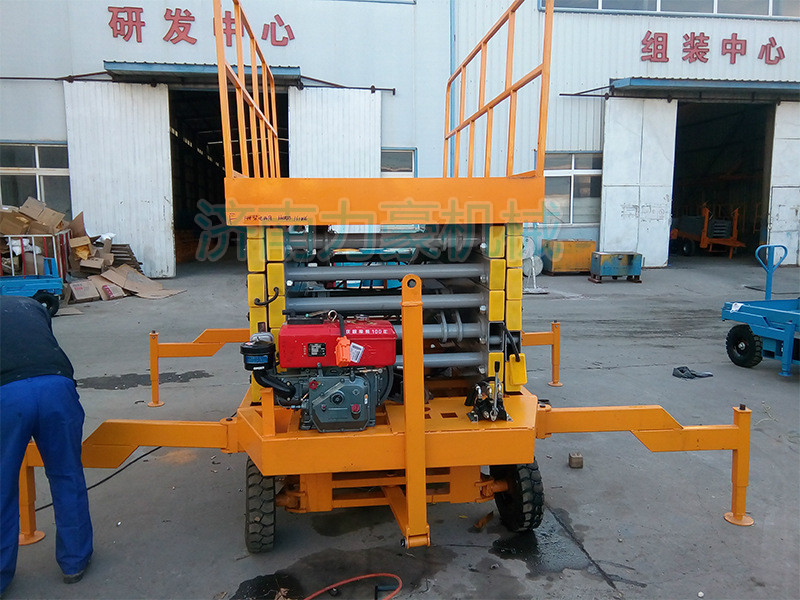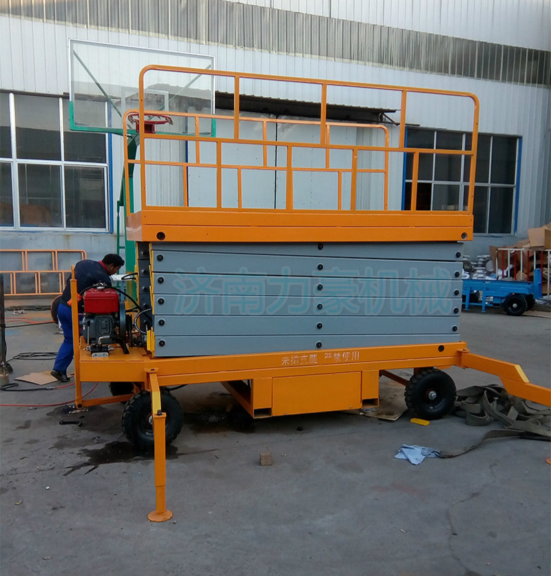 濟南力豪機械全新研發(fā)柴油機動力移動式升降機今天下線了;該機型的誕生即屬于是基礎(chǔ)創(chuàng)新的新產(chǎn)品,有屬于是一種可調(diào)整多種配置的原型母機;機型常規(guī)調(diào)整配置有:直流電源動力,交直兩用互換電源動力,柴油機驅(qū)動動力,電動半自動輔助行走等;移動升降機額定載重為300公斤和500公斤1000公斤2000公斤等,大大提高了升降機的承重安全性能!為方便升降機的移動,輪胎特意選擇優(yōu)質(zhì)橡膠充氣輪胎型,標準化的設(shè)計,統(tǒng)一部件的生產(chǎn)組裝,使的全新移動升降機零部件的互換性,減少維修時間;表面噴砂處理,靜電噴涂,烤漆處理,大大加強了金屬的耐腐蝕度!